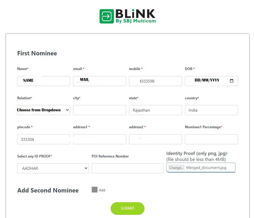 - Post click on submit the potential lands on Nominee page where they can choose their nominees, nominee address pick from nominee’s Aadhar.