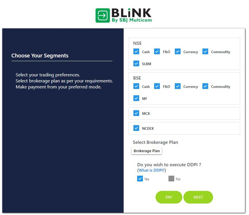 - Post click on Proceed, the potential lands on segment page where they have to choose interested segment DDPI and brokerage Plan.